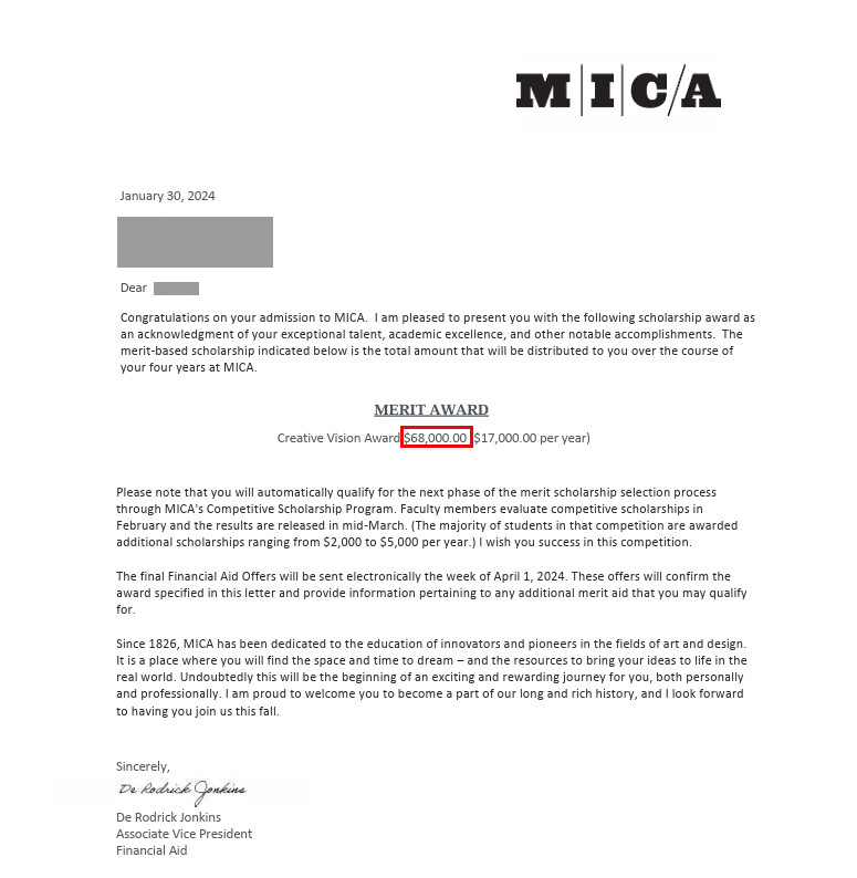 정** 님 Maryland Institute College of Art (MICA) 장학금 $68,000 (연 $17,000) 합격을 축하드립니다.
