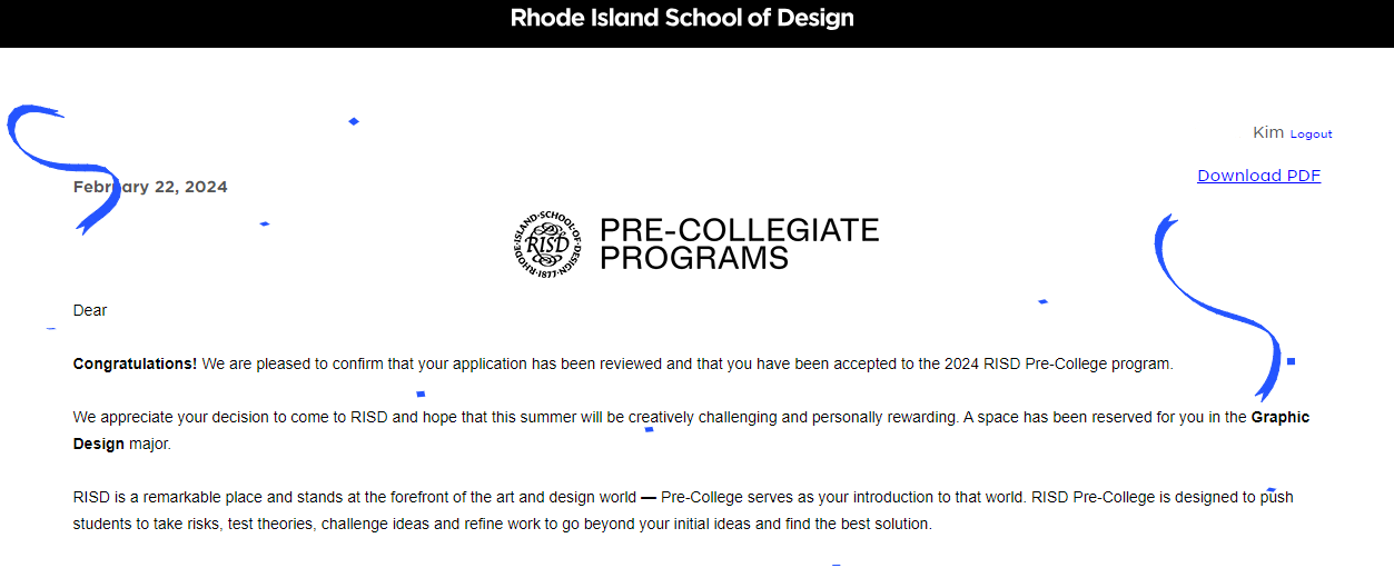김** 님 Rhode Island School of Design (RISD) - Pre-College Program (Graphic Design Major) 합격을 축하드립니다.