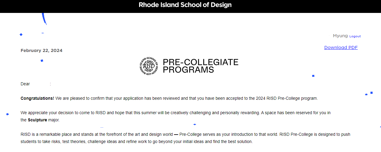 명** 님 Rhode Island School of Design (RISD) - Pre-College Program 합격을 축하드립니다.