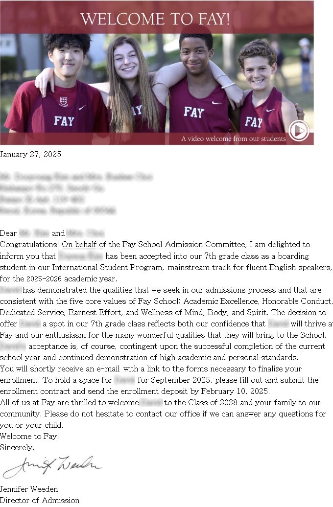 김○○ 학생 Fay School 합격을 축하드립니다.