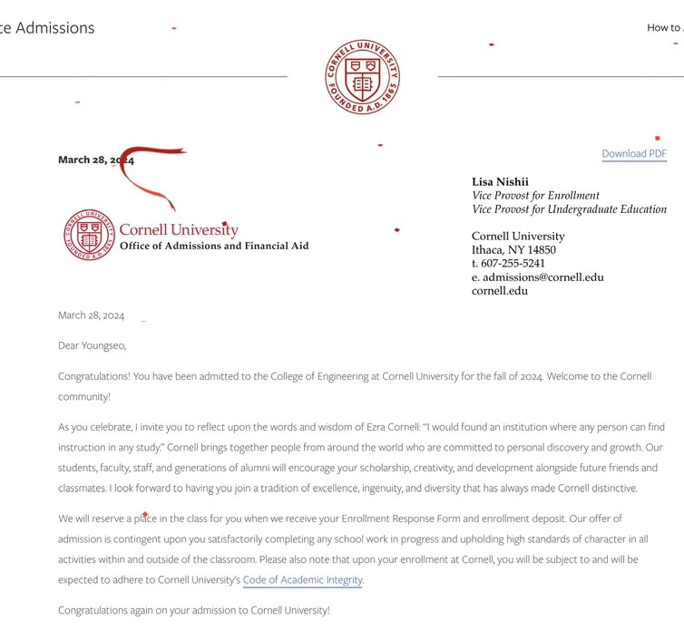 Regular 라운드에서는 아이비리그의 일원 중 하나인 Cornell University 공대 외의 여러 학교에서 합격 메일을 받았어요!
