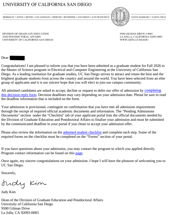 배**님 University of California, San Diego - Master of Science in Electrical and Computer Engineering 합격 축하드립니다.