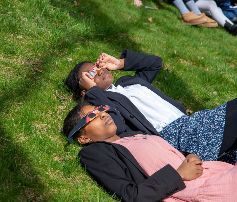이후 학생들은 캠퍼스 잔디밭에 모여 개기일식 안경을 쓰고 직접 개기일식을 관찰했습니다!