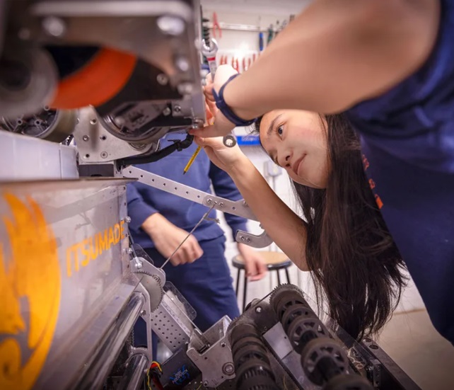 For this year's challenge, dubbed “CRESCENDO,” the team designed, fabricated and coded a 120-lb. robot capable of scoring points by amplifying speakers and playing notes onstage. The robot is named “Itsumade” after the mystical Japanese bird-like creature, symbolizing perseverance.