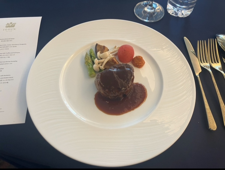 식사는 고급스러운 호텔 코스식 요리로 제공되었으며, 테이블마다 만족스럽고 화기애애한 분위기가 연출되었습니다.