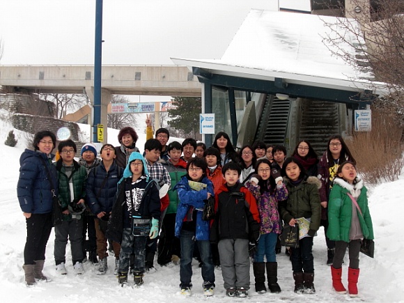 눈을 먹어 보기 위해 입을 벌리고 있는 귀여운 지민이의 모습이 눈에 띄는 단체 사진입니다^^