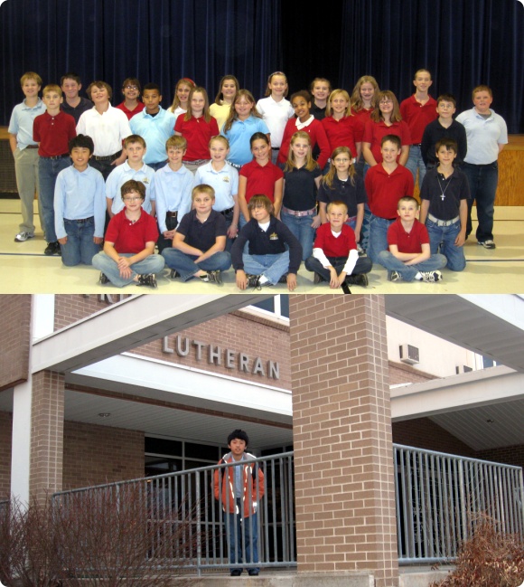 (주)미라클에듀 - 예스유학 미국 중부 조기유학프로그램에 참가중인 건우가 건우네반 학생들과 찍은 단체 사진과 학교에서 찍은 건우 독사진입니다.