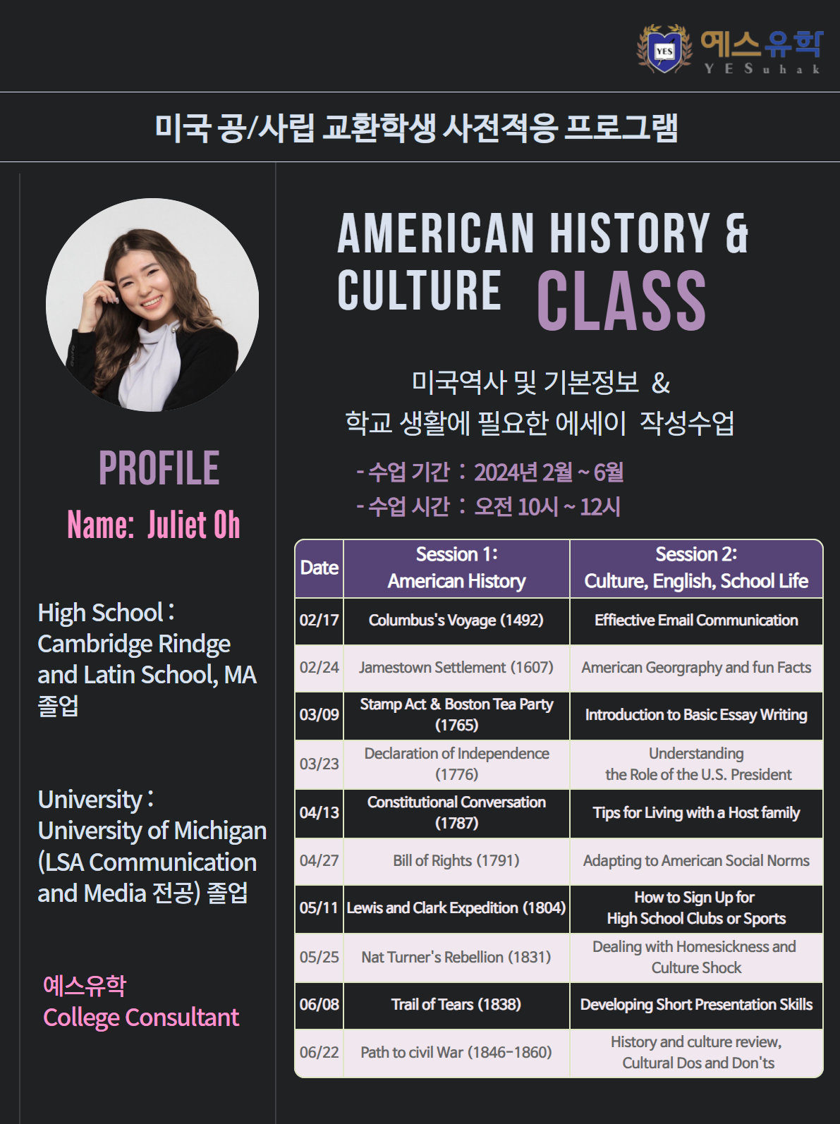 2월부터 진행되며, 토요일 오전 10시~12시까지 진행되니 참가학생들은 필수로 참석하여 미국 생활을 미리 준비해주시기 바랍니다.