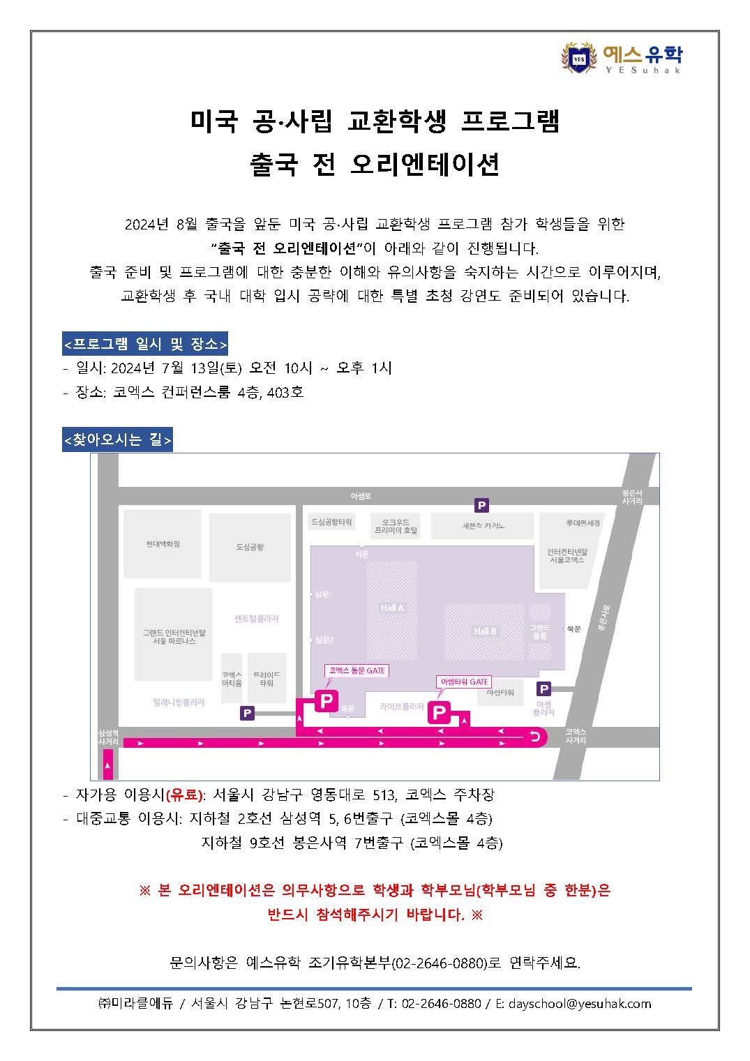 미국 공립/사립 교환학생 출국 전 오리엔테이션 안내 (2024.07.13 토요일)