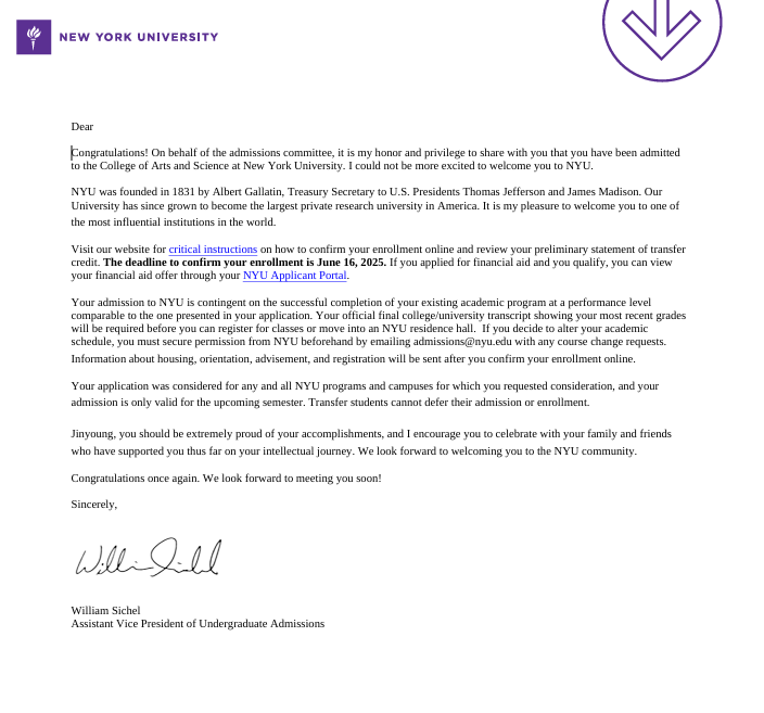 정OO 학생 New York Unversity 합격을 축하드립니다.