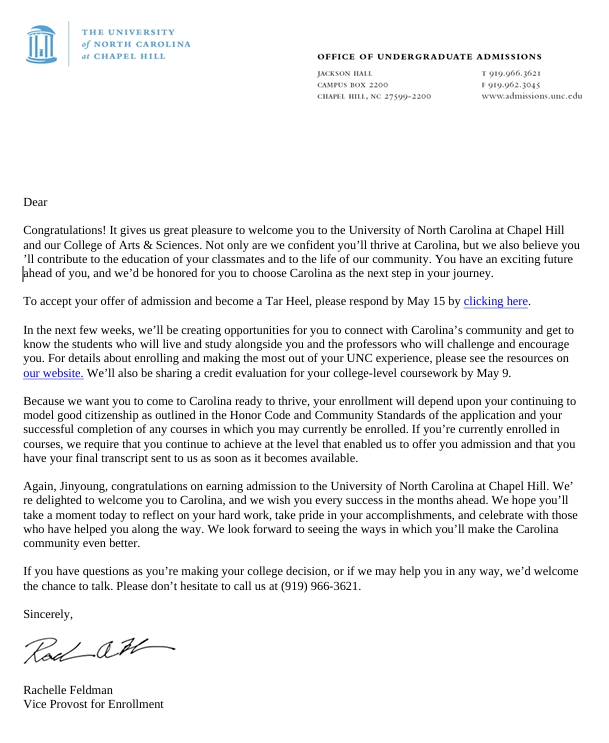 정OO 학생의 UNC-Chapel Hill 합격을 축하합니다.