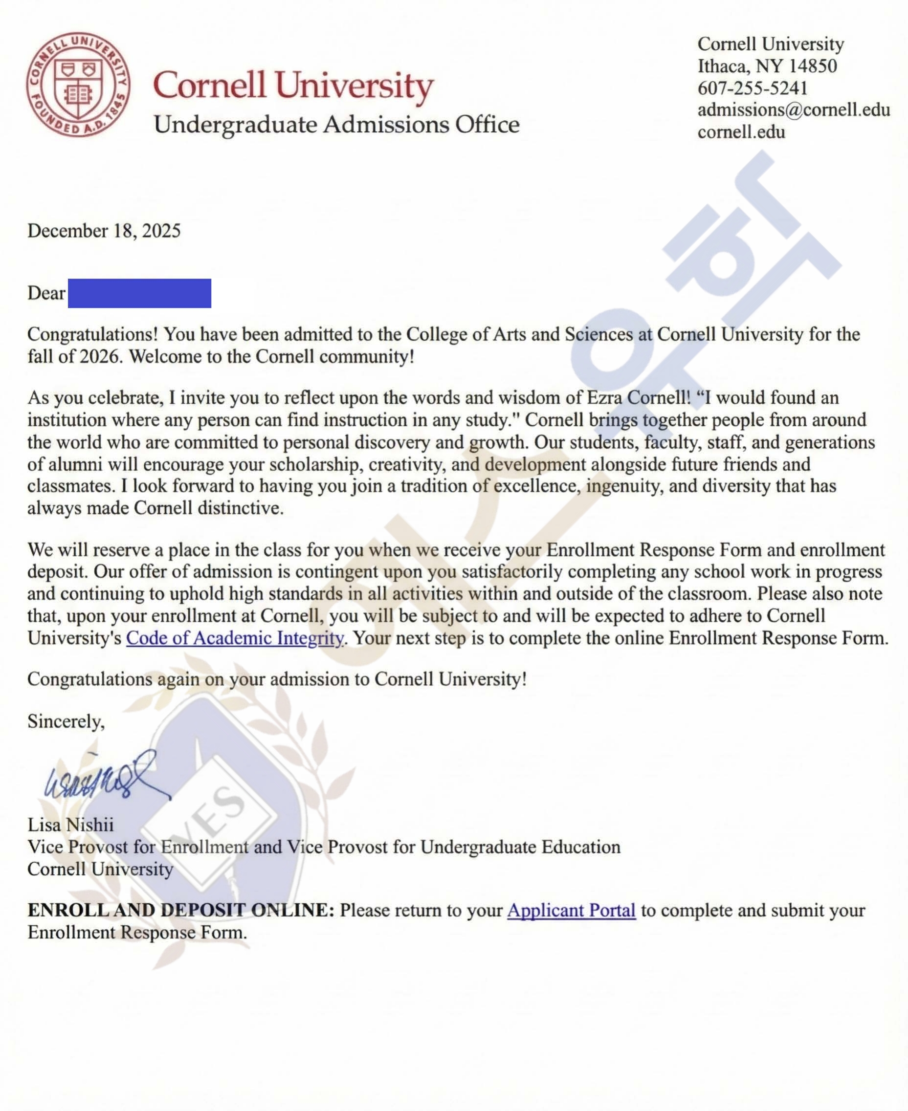 Cornell University "축" 합격 - 윤ㅇㅇ 학생