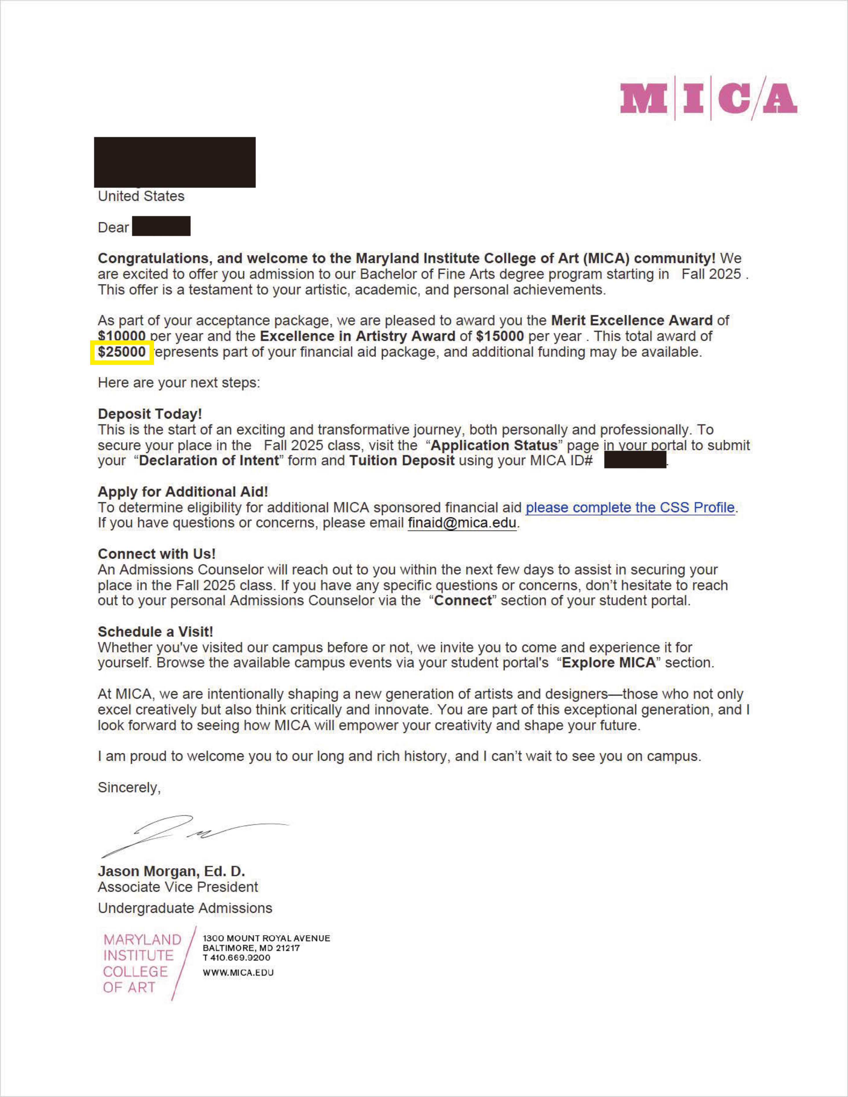 최** 학생 Maryland Institute College of Art (MICA) $100,000 장학금 합격을 축하 드립니다.