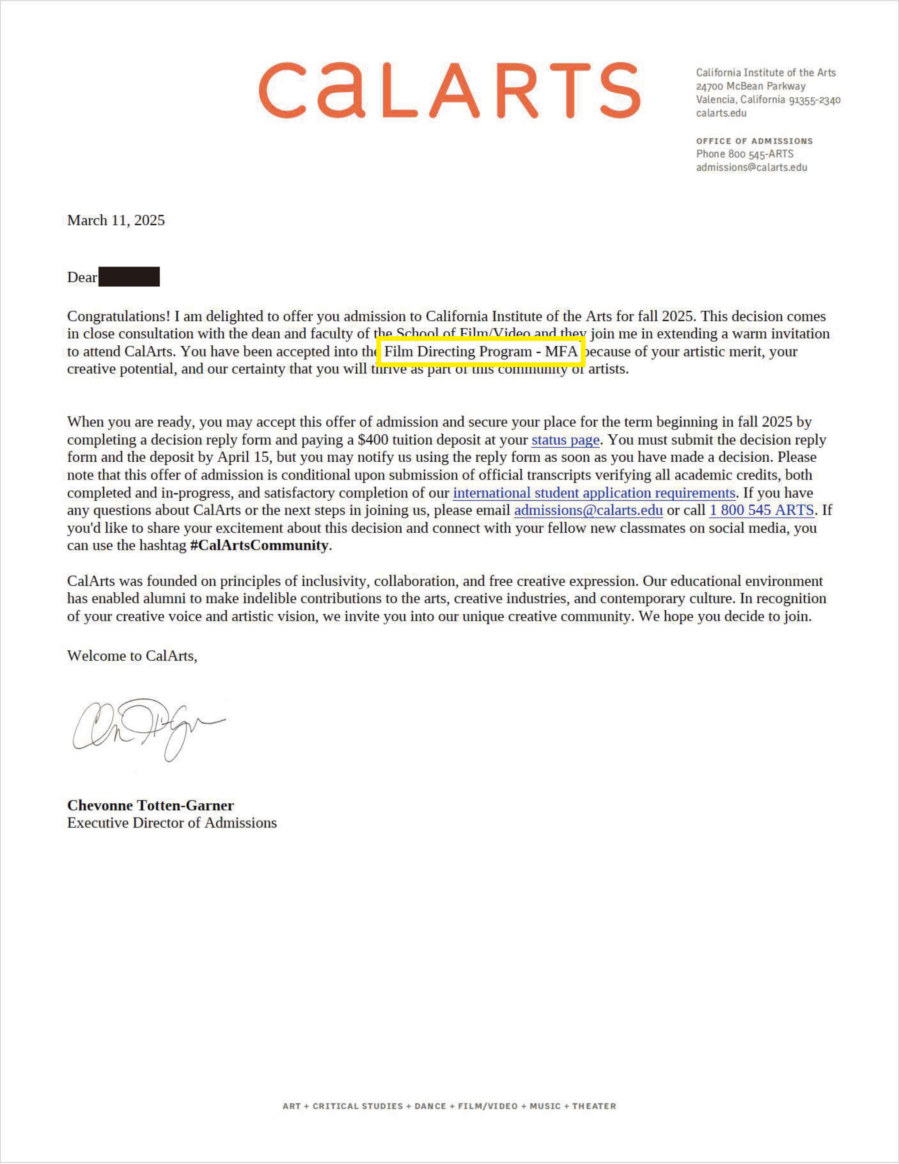 윤** CalArts Film Directing Program-MFA $20,000 장학금 합격을 축하 드립니다.