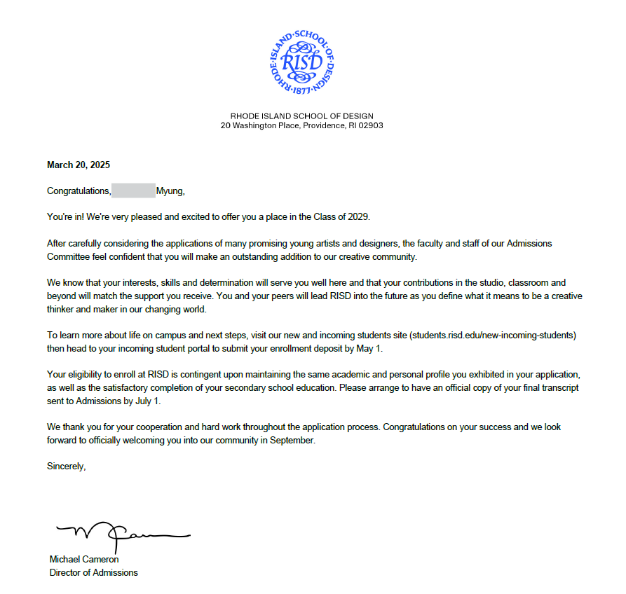 명** 학생 Rhode Island School of Design (RISD) 합격을 축하 드립니다.