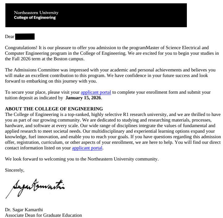김**님 Northeastern University - Master of Science in Electrical and Computer Engineering 합격 축하드립니다.