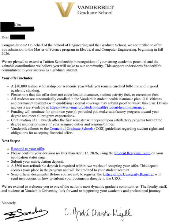 김**님 Vanderbilt University - Master of Science in Electrical and Computer Engineering 합격 축하드립니다 (장학금 $10,000)