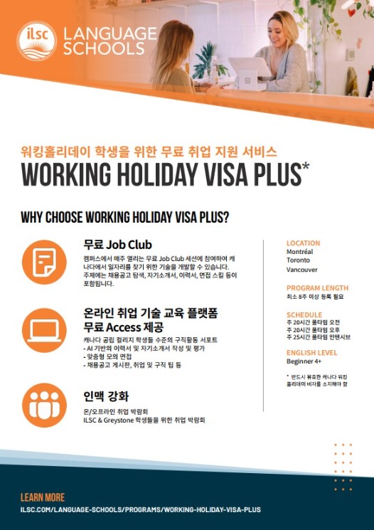 ILSC 어학원 Working Holiday Visa Plus Program의 참가 자격은 아래와 같습니다. - Full-time (주당 20시간 수업) 이상 프로그램 최소 8주간 등록 - Beginner 4 (토플 31점 / 아이엘츠 4.0 / 듀오링고 50점이상의 실력) 이상의 영어레벨 - 워홀비자 소지자 |