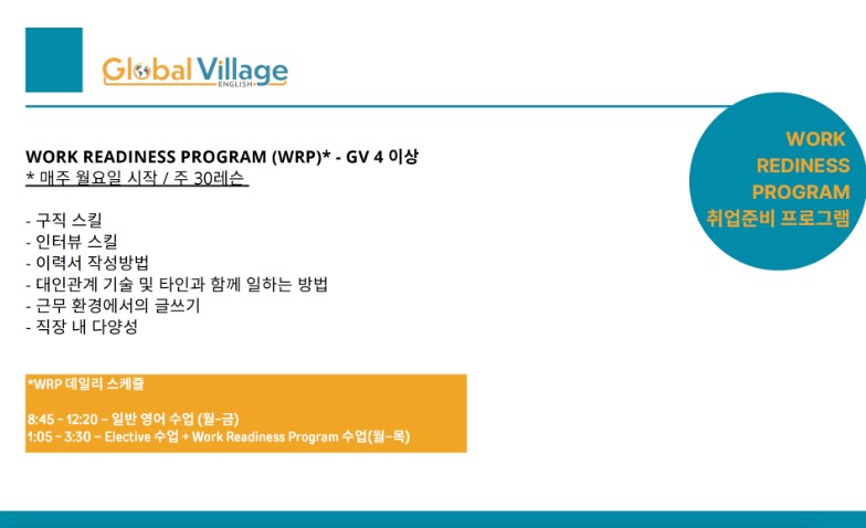 GV어학원에서 제공하는 워홀러 맞춤형 프로그램의 이름은 Work Readiness Program (WRP) 입니다.