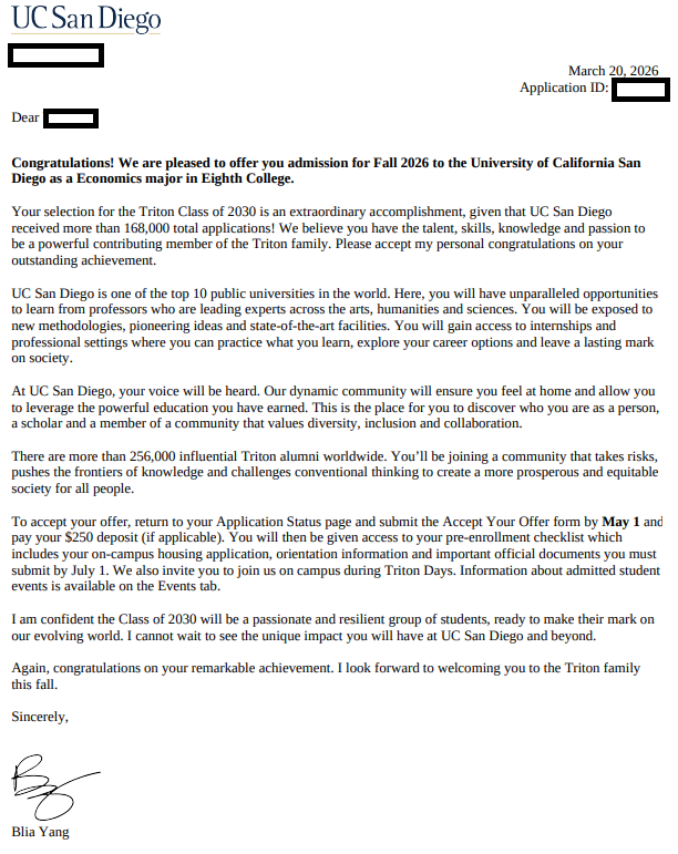 University of California San Diego "축" 합격 - 양OO 학생