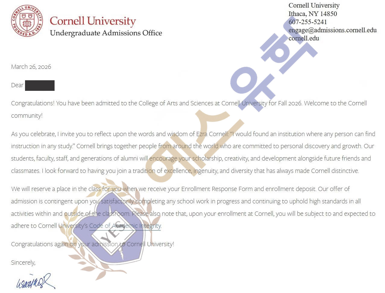 이OO 학생의 Cornell University 합격을 축하합니다.